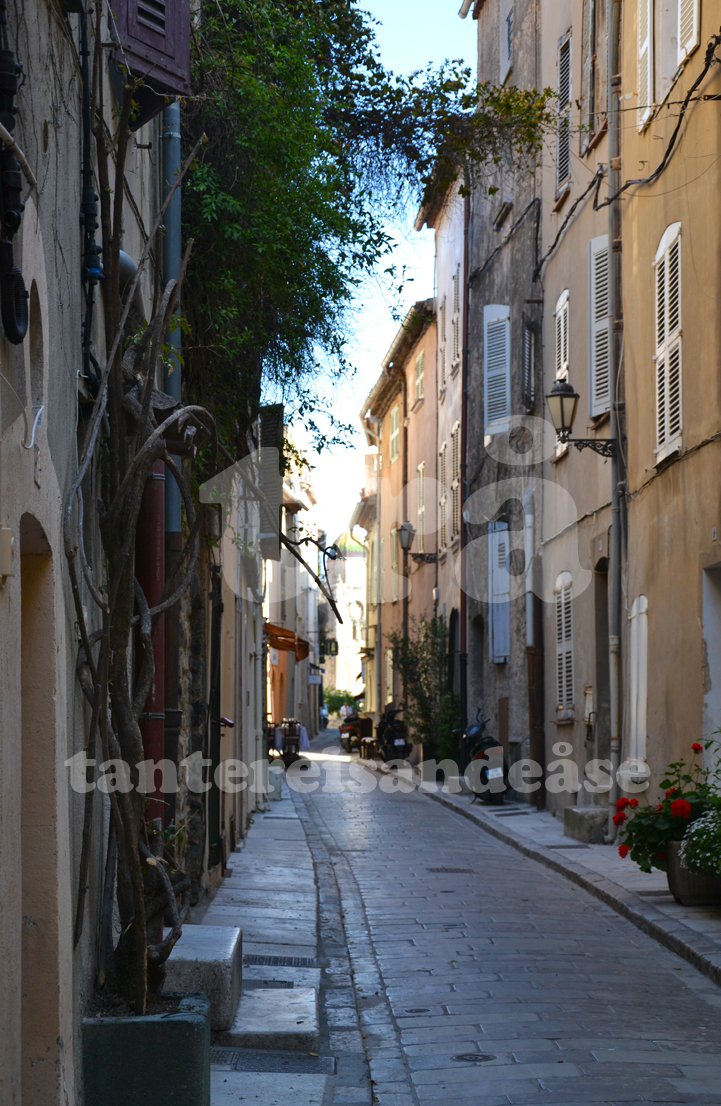 las litt og sov litt, og litt etter litt dukka det opp fleire folk. det vart aldri heilt fullt, men det såg ut som mange lokale tok med familien for å slappe av her på ein søndag. også eit par eldre rosiner frå det tidlegare nevnte hotellet tok turen. eg trur dei hadde ligge der sidan midten av 70talet. me derimot hadde utstyrt oss godt, og kunne grille oss med god samvit og solfaktor 30/50. det skal seiast at solkremen for ansikt (sf 50) fekk augene mine til å renna konstant og eg vart så godt som blind. stygg hud fekk eg også. kjøpt og anbefalt av ein farmasøyt. jaja. me kunne jo ikkje liggje på stranda og late oss heile dagen, så me gjekk inn til byen etter nokre timar (via hotellet for å skrubbe solkrem ut av augene) for å kjøpe crêpes! dette er jo eit must når du er på franske breiddegrader, og crêpes er altså ei pannekake enkelt og greitt. men det er «toppingen» som gjer susen! ein kan velgje mellom søt og salt crêpes, og alle toppingar du kan forestille deg. eg trur likevel den søte varianten med nutella er favoritten til dei fleste. me var ikkje i det søte hjørnet på crêperie bretonne, så valet fall på ost og tomattopping til meg, og ost, egg og pølsetopping til mannen. det smakte fortreffeleg og det var heller ikkje feil med utsikt over havna, skinande sol og kald rosé i glasa. etter at tallerken var tom og karaffelen tømd, var det tid for ettermiddagspromenade ut på moloen. me prøvde å ta inn alt det vakre rundt oss; landskapet med høge fjell og bukter, det klåre havet med bølger og båtar som susa forbi, havna med den blåturkise sjøen som har gitt kysten navnet sitt, og ikkje minst dei sjarmerande husa som ligg der og badar i det blendande vakre sollyset. me hadde vel funne ut kva det var med st. tropez – det var vakkert! og dette skulle me snart forlate.