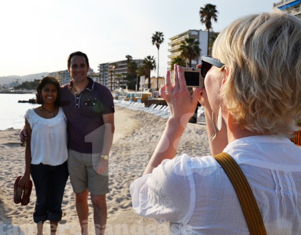 we left st. tropez early in the monday morning, heading back to st. raphael. we had been in contact with my second cousin cameron from australia and his wife preeti since before we left norway, and planned a meet up on the riviera. they were travelling in italy at the time, and decided to take a detour to catch up with us. they also love to travel and were staying in europe for a month, going to italy, croatia, england -and now france! we’d been exchanging e-mails with different hotel options, and decided to go for the hotel mimosas in juan les pins. the golden goal was of course the film festival in cannes wich was opening on that wednesday. juan les pins is a relatively small town just some km east of cannes. it has, with its neighboring city antibes -grown into one large city. to get to juan les pins from st. raphael we had to catch a train. most of the trains don’t stop in j.l.p but keeps on going to antibes. on the train station in st. raphael, we couldn’t find a ticket automat in time (the train were about to leave). so we asked a woman in «train uniform» if we could buy tickets onboard the train. «it is more expensive» was the answer we got. that didn’t sound to terrible to us, so we jumped on the train! the ticket man came to check our tickets and we told him we hadn’t got any, but we would like to buy one. his face changed a bit while he explained to us that it would cost us. and it certainly would! it wasn’t just expensive, it was in fact a fee for traveling without tickets. so at the cost of 50 € per person we got ourselves to antibes. but -what doesn’t kill you makes you stronger. in antibes we went to the tourist info right outside the train station. the two girls there were very helpful and told us to take a bus to j.l.p and were to go on and off. some minutes later we were on our way to the hotel, and it struck us how quiet and nice the area was. and it got even better! our hotel was surrounded by a tropical garden, and had a swimming pool! happy days! we got our room and were very satisfied. the hotel mimosas weren’t modern at all, but it had something special about it. and the staff were very friendly and welcoming. preeti and cameron were on they’re way, so we decided to check out the city centre while waiting for them. the city centre of juan les pins wasn’t to big, but very nice and lively. the beach on the other hand went for miles and miles.. we got to do a little bit of shopping and some late lunching while we waited for our travel companions. we had a good meal and lovely view at the l’up side down.  as our friends were approaching, we were waiting for them at the train station. i’ve been to australia twice and visiting cameron and his family. it’s been 5 years since last i saw him, but when i met him again it only felt like days ago. he was the same friendly, warm person. this was the first time we met preeti, but it didn’t feel like that. we connected instantly and just loved her! we took them back to the hotel and after a nap ore two, it was soon dinner o’clock. on our hunt for some good dining we found ourselves on the beach were we had a stroll while we looked at (and photographed) the sunset. hungry: we went up and down the streets of j.l.p to find a place to suit everyone’s appetite. the lucky place to have us was an asian restaurant. the food was good and the company was even better! we talked and laughed and planned the next days. monaco and cannes was on our schedule.