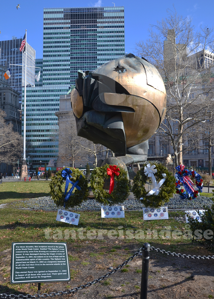 denne stod på plassen mellom dei to tvillingtårna, som eit symbol på fred frå 1971 til 2001. då flya styrta inn i tvillingtårna vart skulpturen skadd –men ikkje øydelagt. den blei midlertidig plassert her, men skal tilbake til «ground zero» når dei nye tårna er reist. etter å ha gått gjennom sikkerhetskøen til ferja me skulle ta, kunne me gå ombord. det var ein fin båttur, om enn litt kaldt. flott å sjå manhattan frå avstand.