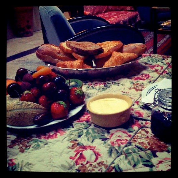 torsdag morgon, me stod opp tidleg, pakka alt ferdig og gjekk ned til frukosten. mannen sjekka mailen då me sat der og fann plutseleg ut at me hadde reservert hotellet éin dag til! me skulle mao ikkje reise, så me senka skuldrane att og fortsette på frukosten. hotellet vårt le corps de garde i saint martin er det mest unike hotellet me har budd på. innreiinga var gjort med sjel. der var gamle møbler, årer som gardinstenger, draperingar og kandelaber, gamle bilder og interiørmagasin. i salongen/opphaldsrommet vart det servert frukost, aldri før klokka 8.30, men kva tid som helst etter det. og for ein frukost! her var det dekka med friske fruktfat som bugna. me fekk ferskpressa appelsinjuice og nytrekt kaffi, varm toast, baguettar og croissantar og yoghurt. alt servert av den alltid like blide og hyggelege, litt vimsete og småspringande dama. sjølv om det nok ikkje var ho som eigde hotellet, stod ho for å halde hjula i gong. servering, vasking og stelling av rom, oppgjer ved avreise og telefonvakt var stillingstittelen hennar. ho kunne ikkje eit ord engelsk, men snakka og gjentok seg sjølv heilt til me nikka og smilte.