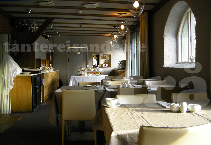 laurdag morgon og me nærast spurta ned til første etasje der frukosten vart servert. fint dekka bord og sola som sneik seg inn vindauga.