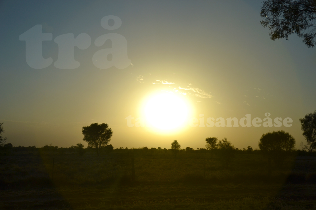 i grevens tid, eller før det vart mørkt om du vil, svinga me inn til dagens mål: småbyen katherine. me hadde funne eit motell som høyrdest greitt ut i lonely planet, så me plotta adressa deira inn på gps’en. då me var komen fram, la me merke til at det var ein stor fugleflokk som svevde over hovuda på oss. men det var noko merkjeleg med denne fugleflokken. den tok aldri slutt. og ved nærare ettersyn såg me at det ikkje var fuglar, men flaggermus som fauk over hovuda på oss. tusenvis av flaggermus på veg inn til byen ved mørkets frambrot. dei laga ikkje ein einaste lyd, berre svak flaksing med vengene dersom du høyrte veldig godt etter. ein litt fin og litt skummel opplevelse. paraway motel var absolutt ein kurant stad å overnatte. for 145 aud fekk me eit plenty stort rom med aircondition, heilt greitt bad, utandørs basseng og noko som skulle vise seg å vera ein ganske kjekk restaurant. heile motellet bar preg av å vera noko datert, men det gjorde ikkje så mykje. me hadde ikkje høge forventingar og var nøgde med ryddig rom og god service. restauranten hadde ikkje alvorleg lengje ope og me burde visst bestilla mat før kvart på åtte. som sagt så gjort, og den hyggjelege servitøren vår troppa opp med den eine gode retten etter den andre, i tillegg til ei god, sprudlande pinot noir frå jacob’s creek. han skulle visa seg å vera frå bonifacio på korsika. me delte litt opplevingar frå (favorittøya vår) korsika med han og fekk vite at han var på reise, og jobba seg rundt i australia i løpet av eit år. rundt klokka ni var alle klare til å stengja og gå heim, men sidan me sat der med vinen vår og det sedvanlege slaget med idiot, lot dei oss få sittja så lengje me ville. me kunne ikkje ta for mange slag, for neste dag venta nok ein long køyretur.