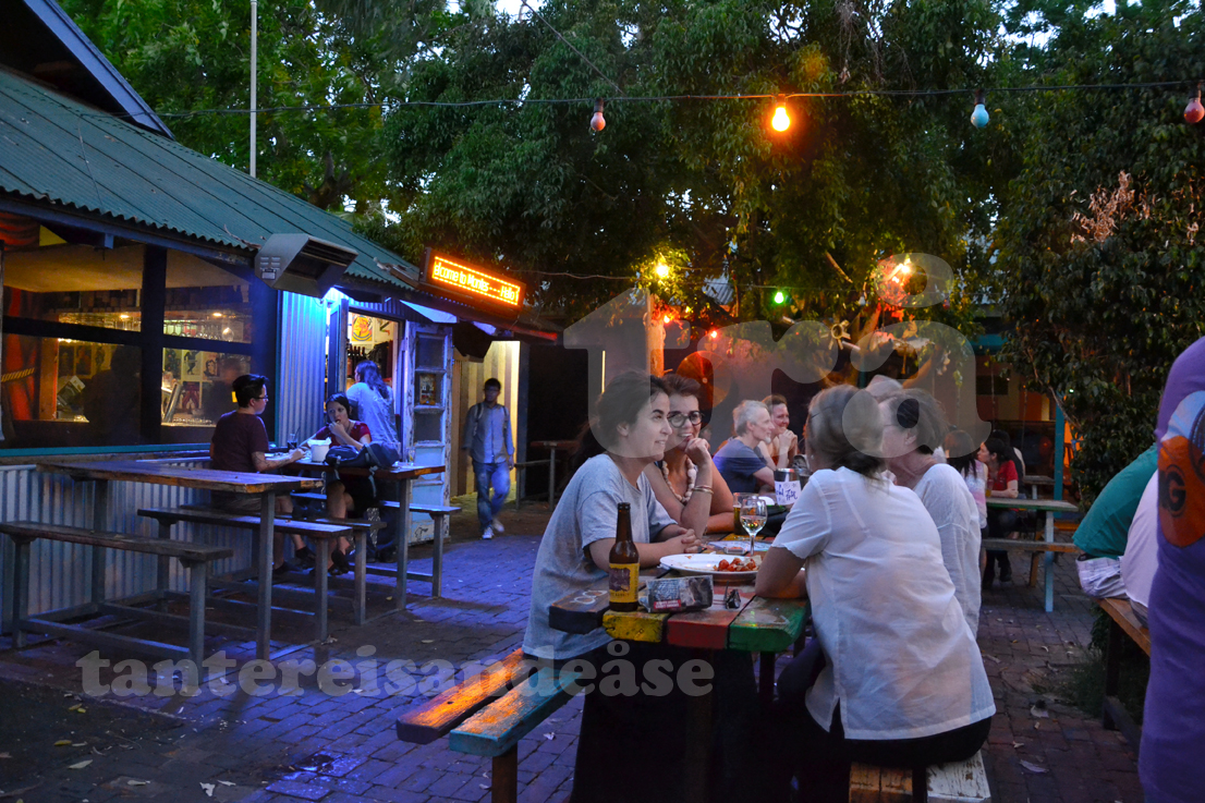 me pløydde gjennom tripadvisor for å finne ein overnattingsstad i byen, og kom fram til at aurora var eit hotell som var både sentralt og fint. etter å ha ete ein knakande god lunsj på vanntanken, gps’a me oss fram til hotell aurora. rommet vart veldig fint og lokaliteten upåklageleg. me hadde på dette tidspunktet bestemt oss for å drøya turen vidare litt, pga vermeldinga og litt fordi me trengte å roa ner tempoet. det hadde byrja å blåsa ganske mykje, og dette tok seg meir og meir opp utover kvelden. men det gjorde ikkje så mykje. me såg oss litt om i hovudgata før me enda opp på monte, som skulle visa seg å bli favorittplassen vår i alice springs. her bestilte me mat og sat ute under stjernene og lyspærene, medan folk i stort sett alle aldrar hadde funne vegen hertil.