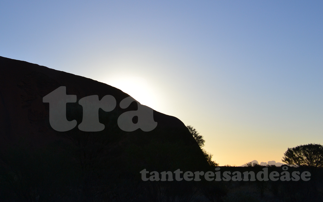 det er ikkje noko me har for vane å gjera når me er på ferie, men for andre dag på rad var me oppe før sola. 5.30 ringde klokka, og ikkje lengje etter var me ute i den kalde morgonen med kurs for uluru. kven som har funne på dette veit eg ikkje, men det ligg utan tvil bra marknadsføring bak, for ein må nemleg sjå uluru både ved solnedgang og soloppgang! og like mange hadde funne vegen opp til utkikkspunktet denne morgonen. me stod der alle og hutra medan denne store sovande steinen sakte vakna til live og bretta ut fargane sine litt etter litt.
