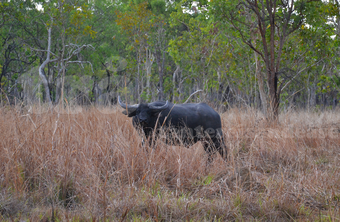 3 meter høge såg det også ut som dei neste dyra me traff var, nemeleg vannbøflane. brått stod dei der i vegkanten. skrekkslagne stansa me bilen og spurde kvarandre om dei var ekte. det var dei! svære, svarte dyr som hadde mosa bilen vår om dei hadde bestemt seg for det. me knipsa eit par bilder før me forta oss vekk.