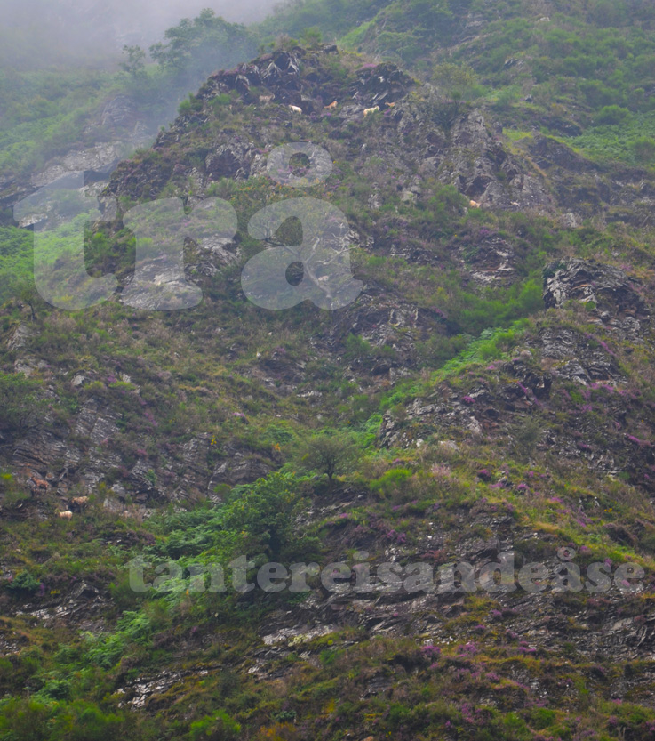 den hadde ein krypt som fungerte som eit lite kapell for pilegrimane. her kunne dei be for pilegrimsruta si eller takka for ei trygg reise gjennom pyreneane. eller noko heilt anna. me takka for oss i roncesvalles og køyrde vidare nokre meter opp (til omlag 1000moh), før vegen tok oss nedover att i eit noko måbødal-aktig terreng. heile tida langs landegrensa. her var det grønt og frodig, og geitene klora seg fast over alt i fjellskrentane