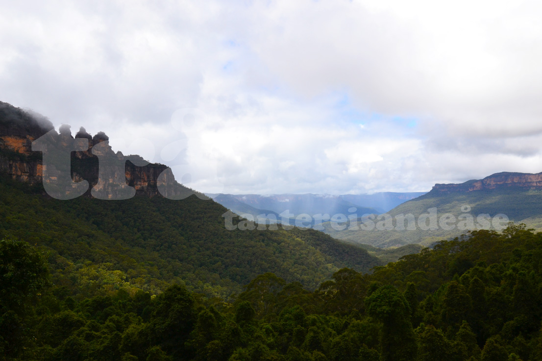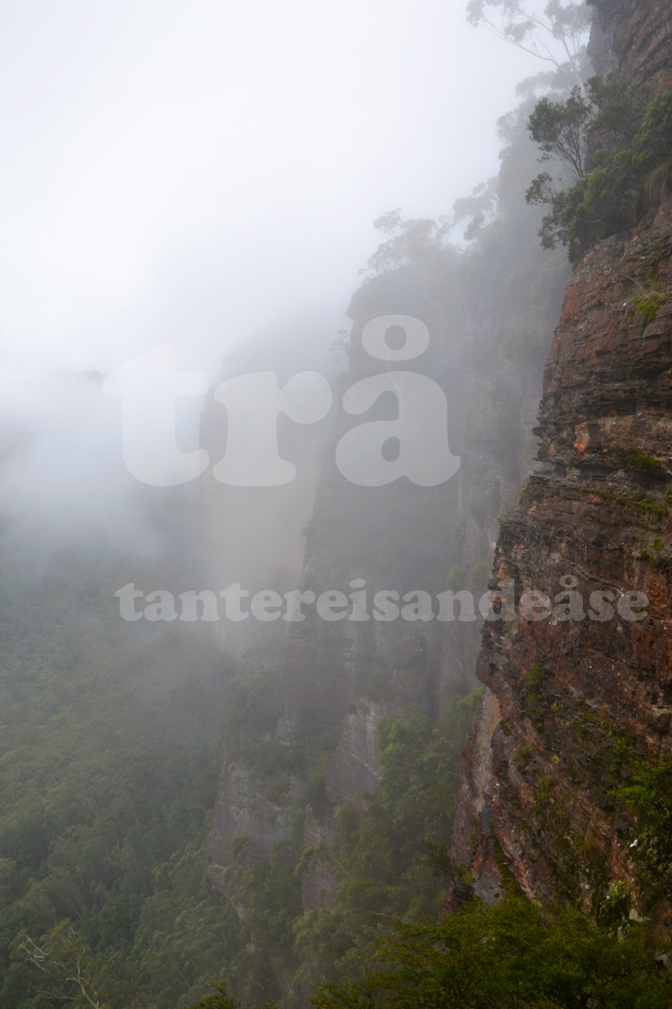 måndag morgon tøffa me oss oppover till dei blåe fjella med eit tidleg tog. det tok omlag to timar frå togstasjonen til katoomba, som var eitt av to aktuelle stopp i the blue mountains. me kjøpte billettar till ein hopp-av-hopp-på buss som skulle ta oss rundt i området, og betalte litt ekstra for å få tilgang til to taubanar og ein «fløybane». første stoppet vårt var utsiktspunktet echo point der me skulle sjå dei tre søstrene. tre små fjelltoppar som ligg attmed kvarandre på ei rekkje. det einaste me såg var ei tjukk grå skodde, og ei røys med asiatar som peika og tok bilder.