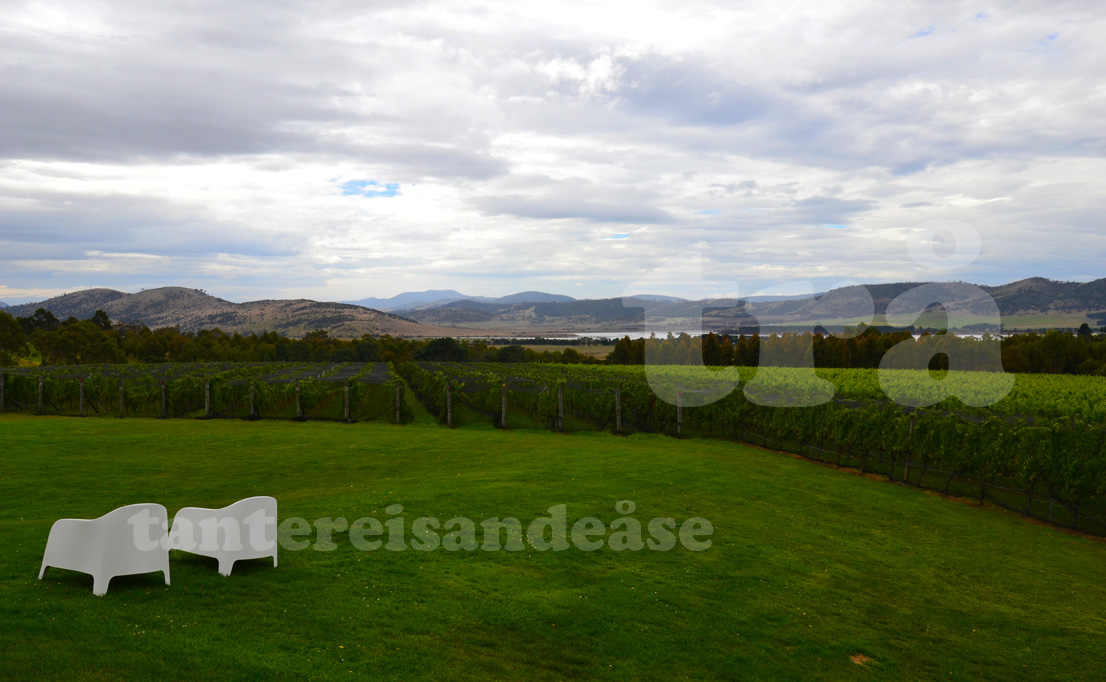 då det byrja å regna gjekk me inn i eitt av dei små steinhusa og kjøpte oss kaffi. det såg ikkje ut til at litt surt vêr gjorde noko, for det var stappfullt av folk overalt. etter å ha sett alle bodene minst éin gong, sette me oss i bilen att og bestilte to pizza’ar. desse tok me med oss til shanti (mi tremenning) og mark. shanti og mark var «grunnen til» at me var i australia denne gongen, me var nemleg invitert i bryllaupet deira. etter å ha nytt utsikten frå leiligheten deira, snakka om bryllupet og ete pizza, køyrde me avgarde med marit. me sette kursen for vinmarkene utanfor byen, me skulle på vinsmaking. det var nemleg open dag hjå alle vingardane denne helga, og første stopp var frogmore. den hadde ein utruleg flott utsikt frå lokalet, som folk kunne leige til bryllaup og andre tilstellingar.